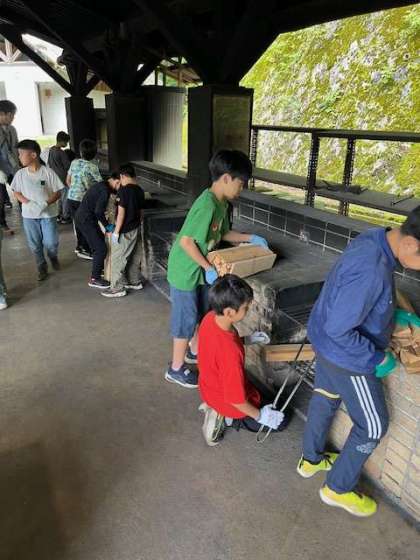 かまど係がかまどの準備を着々と進めています。説明をしっかり聞いて準備万端です。