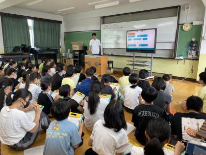 総合的な学習の時間『大黒柱 for future』の一環として、今回は元プロサッカー選手の方にお越しいただき、お話を聞かせていただきました。どの仕事も本質は同じで、それぞれの仕事はつながっていることや、誰にもチャンスは転がっているので、人が面倒くさいと思うことを率先してすることで、信頼を積み重ね、一生懸命、目標に向かって頑張ることが大事、自分次第でチャンスをつかみ取ることができることを教えていただきました。いきなり大きなことを成し遂げるのは難しくても、学校生活の小さなことをまずは1学期の終わりまでやり切ることができれば、今日の学びを生かせそうですね。他にもたくさんお話していただきました。その内容は子どもたちに聞いてみてください!