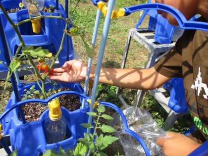「トマトの実が赤くなっている!」「オクラの実が少し出てきたよ!」