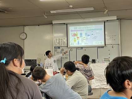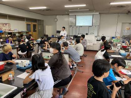 2組は化学の実験をしました。透明な水があっという間に染まる。マジックではありません。その理由は・・・?化学にあるんですね!それを探るために、3つの実験を行いました。グループでその謎に迫りました。