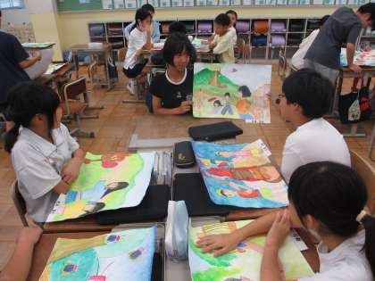 花背山の家の思い出を絵で表現しました。班で交流する中で、「自分がこだわっていた部分を認めてもらえて嬉しかった。」や「次に絵具で表現するときはまねしたいな、と言ってもらいすごく自信をもつことができた。」という感想があり、和やかな時間となりました。