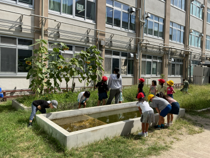 今、教室の窓から、ひまわりの花が見えています。サマースクールに来た子ども達から「大きくなったね!」という声が聞こえてきたので、ひまわりを見に行くことにしました。ひまわりは、みんなの二人分くらいの大きさに成長していました。中庭の池には、やごの抜け殻があり、じっくり観察する子もいました。