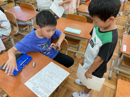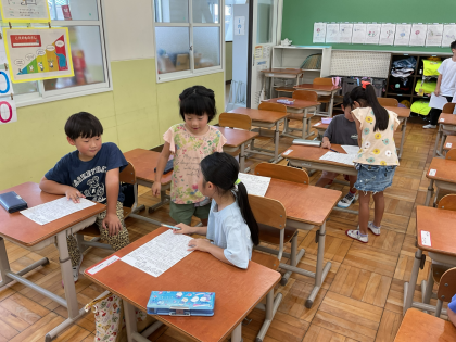 教室では、夏休みの宿題を集めたり、ビンゴをしたりしました。夏休みの思い出を友達とたくさん話すことができました。始業式は、26日(火)です。元気に登校してきてくれることを楽しみにしています。
