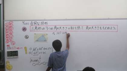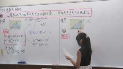 合同な図形で、三角形の1つの内角と外角をどうやったら求められるのかを考え合いました。子ども達同士で、対話して見通しをもち、自力解決をしました。そして、どのように考えたのか、なぜそう考えたのかを説明しながら、全体で解決していきました。