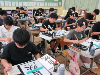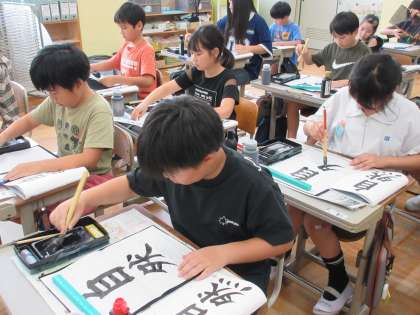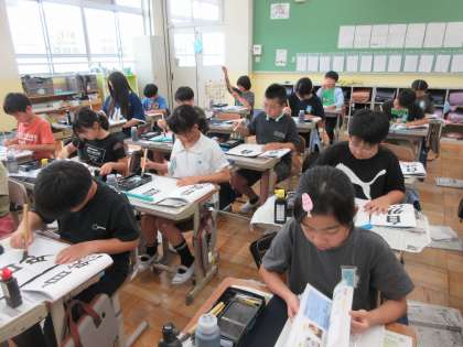 「漢字どうしの大きさに気をつけて書こう」というめあてのもと、それぞれの字の大きさや書始めの位置に注意して書きました。もちろん「こしぴん」「足ぺた」「ぐう一つ」の姿勢で、さらに左手で半紙を押さえて筆を立たせてうで全体で書くことにも意識してできました。