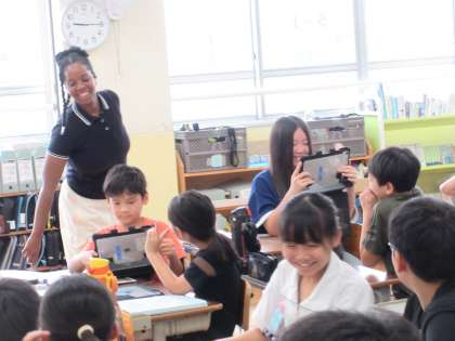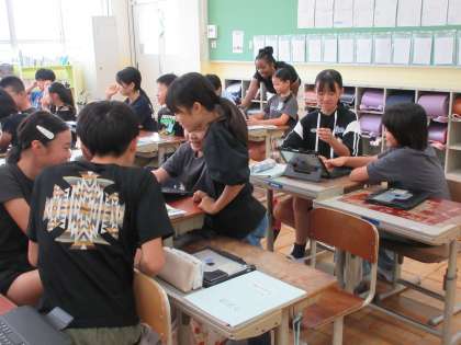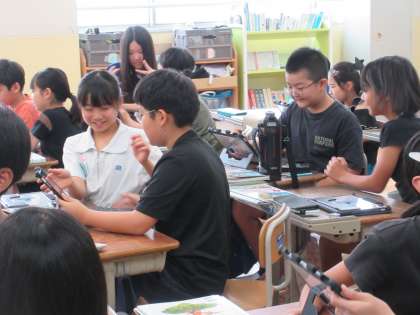 外国語の授業ではiPadで写真を撮って、友達の名前と「can」を使って、友達ができることを紹介するという活動をしました。写真を撮るときも、その後の交流もわいわいとても和やかな雰囲気で活動する姿が見られました。紹介だけではなく、英語で質問をしたり、答えたりと深め合うこともできました。