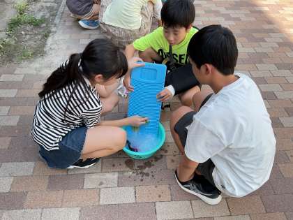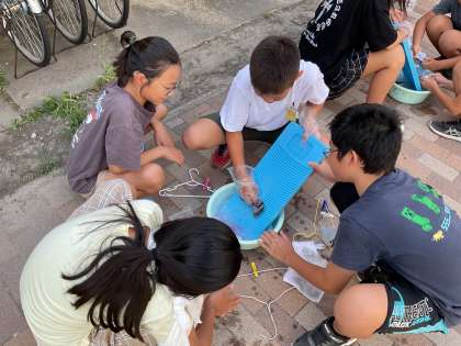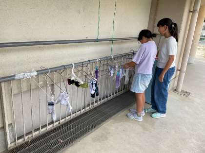 手で洗うだけでなく、洗濯板も上手に使いこなしていました。しっかり洗ったあとは、すすぎを2回します。SDGSも意識しながら節水!絞ったあとは、しっかりと干すことができました。汚れたままの靴下と比べると一目瞭然!子どもたちは美しくなった靴下を見て、こんなに違うんだと感動していました。家でも実際にやっていけるといいですね。