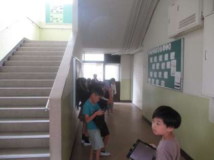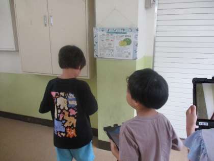 国語「みの回りのものを読もう」の学習で、自分たちの回りにはいろいろな情報が示されていることを学びました。新しく配布されたアイパッドを持ってさっそく校内に情報がないか探検です!探してみるといろいろなところにあって子どもたちもびっくり。「ここにあるよ!」「あ、こっちにも見つけた!」写真に撮ったものを使って、今度は教室で学習します。