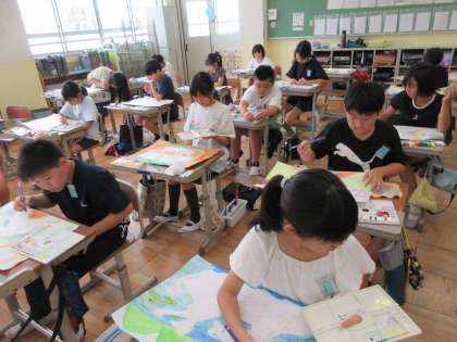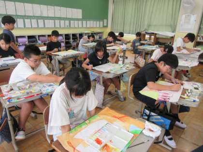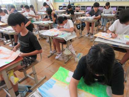 登場人物が旅をして出会ったもの、人に思いを広げて、どのように描こうか、どんな表情にしようか、どんな色をぬろうか、何からぬろうか考えながら、作品に向かっています。