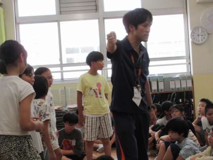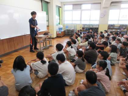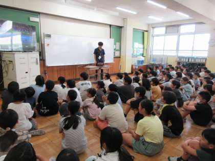 5年生の学年体育ではスポーツフェスティバルを見据えたリレーの話がありました。かつてオリンピックのリレーで日本チームが銀メダルを勝ち取ったVTRには5年生から歓声が上がりました。そこからバトンパスがリレーの勝敗を左右することを知り、その基本を教わりました。チームプレーですので、学年全員で心一つに心のバトンをつないでいけるといいですね。