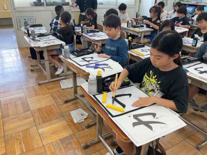 書写の学習の様子です。「まがり」に意識して「力」の題字に取り組みました。「まがり」の書き方にも慣れ、力強く書き上げることができました。