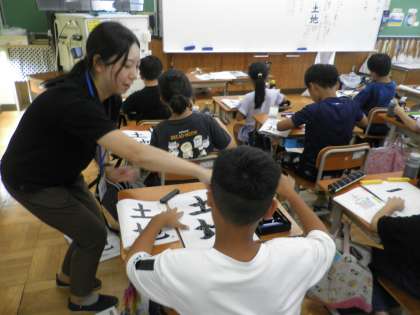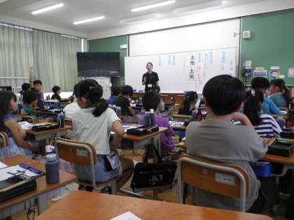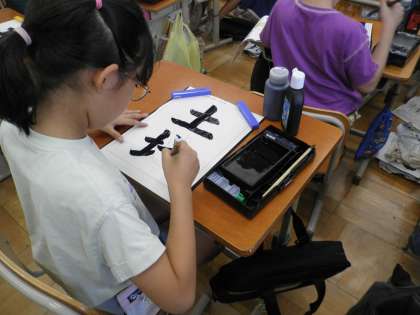 今日、黒田先生の書写の学習がありました。全く学習をしない段階で「ためし書き」をして、子どもたちに自分の字と教科書の字の違いを主体的に発見させ、そこから学習が始まりました。正しく書くポイントを押さえ、「かご字」や「骨書き」の練習を通して、子どもたちはとても静かな空間で、自分の字に集中していました。