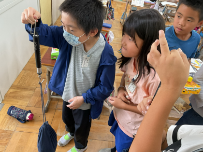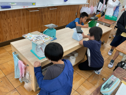 調べたい物に合わせて、はかりを変えて重さを調べました。初めて触るバネばかりに給食袋などを吊るして重さを調べていました。