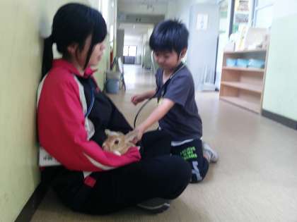 生活科の授業で、学校で飼っているうさぎの「ミルク」と「ココア」を触ったり、心音を聞いたりしました。心臓の音が「どくん どくん」と聞こえたことや、触ってふわふわで気持ちよかったことを話していました。