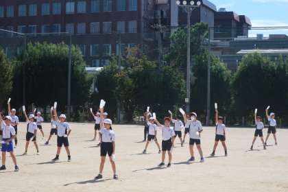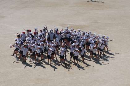 体育館で全体の動きを合わせてからの、運動場での確認です。