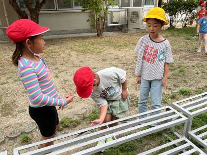 自分たちの身の回りにあるものを触ると、どんな感じがするかな?教室にあるものや中庭・運動場にあるものを触ってみました。同じものでも触り心地が違う部分があったり、触り心地が似ているものがあったりして、とても面白かったです。