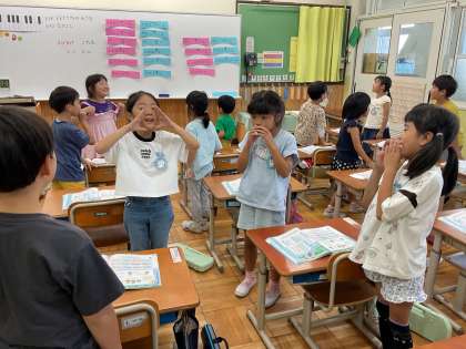 「やまびこごっこ」では、呼びかけとこたえの面白さを感じ取りながら歌っています。今日は、四人グループになり、人数や強弱、音色を工夫して歌いました。それぞれのグループで自分たちの思いにあうように歌おうとすることができました。