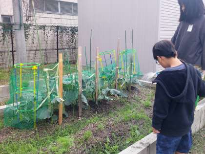 ブロッコリーが大きくなってびっくり!茎も太くなり、葉っぱも大きくなりました。鳥が葉っぱを食べに来たり、青虫が葉っぱに穴を開けたりするので大変です。子ども達が、青虫を見つけて取り除いてくれました。これからも、探してくれることと思います。
