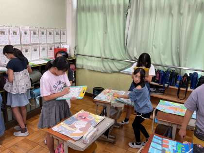 子どもたちが「過去一こだわれた!」と嬉しそうに言っていたお話の絵が完成したので、その鑑賞会をしました。構図、色づかい、奥行きなど、細かいところまで考えに考えぬいた作品たちを鑑賞し、絵から感じることや真似したいと思う工夫などを見て回りました。今回、こだわったことを忘れず、絵をかくことに親しんでほしいと思います。