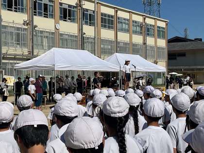 閉会の言葉の時の様子です。スポーツフェスティバルのまとめとなる言葉に思いを込めて伝えてくれました。考えたメッセージ、とても素敵でした♪開会式で活躍した人たちもありがとう!