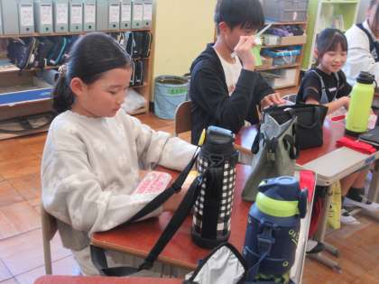 スポーツフェスティバル終了後、楽しみにしていたお弁当をみんなで輪になっていただきました。わくわくしながらお弁当箱を開け、やった!ウインナー入ってる!」「おにぎり入っていたわ。」など歓声があがっていました。