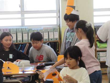 ハロウィンのお面を作っています。いつの間にかより怖そうなお面を作るためには…と試行錯誤が始まりました。