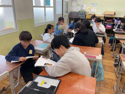 国語科は『古典芸能の世界』を学習した後に、『狂言「柿山伏」を楽しもう」に入りました。主役にあたる「シテ」と相手役にあたる「アド」に分かれ、掛け合いがおもしろいのが狂言です。ペアでその役になりきって、音読を楽しんでみました。見本で見せてくれた2人の掛け合い、とてもよかったです!