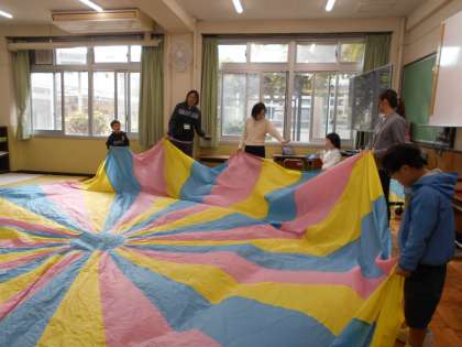 葛野校区に住んでいる、西総合支援学校のお友だちが来てくれました。自己紹介をした後、風船バレーやバルーンなどを楽しみました。久しぶりのお友だちと遊べて嬉しそうな子ども達でした。あと2回交流があります。楽しみです。