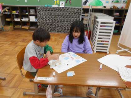 道徳で「ふわふわ言葉とちくちく言葉」の学習をしました。日頃を思い出しながらちくちく言葉・ふわふわ言葉を考える姿があり、たくさんの言葉が出ました。今日は、その学習を生かして「すごろく」を作りました。ちくちく言葉の所に止まったらコマを戻す。ふわふわ言葉に止まったら先に進めるなどのすごろくです。来週すごろくをするのが楽しみな子ども達です。