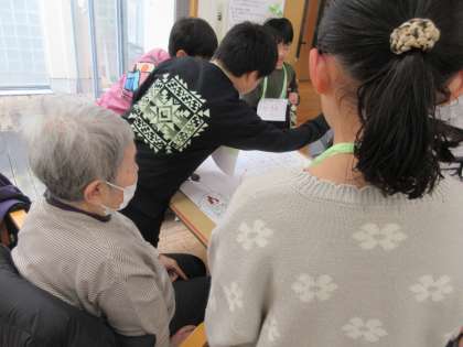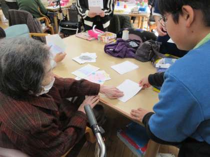 葛野デイサービスで利用者さんと交流しました。自己紹介、インタビューの後、作ってきたゲームを通して、楽しい時間を過ごしました。利用者さんが、「また来てね。」「楽しかったよ。」という言葉をかけてくださったことが子ども達はとても嬉しかったようです。
