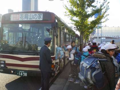 秋晴れの中,5年生,73名全員が,元気に「花背山の家」に出発しました。