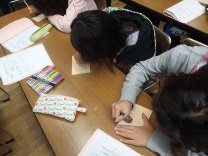 手紙を書くのに不慣れな子どもたち。がんばって書いています。