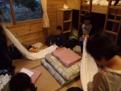 朝の集いはロッジ裏で行いました。