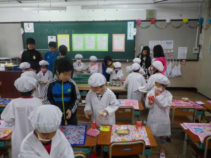 一年生にとって、はじめての給食です。エプロン・ぼうし・マスクを身につけるところからいろいろな手順を教えてもらいながら、準備を始めました。六年生がお手伝いに来てくれています。