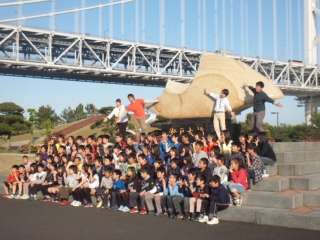 壮大な瀬戸大橋をバックに学年全体で記念撮影。