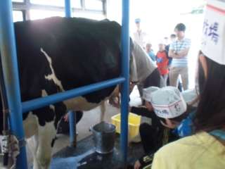 牛の乳しぼりをしています。