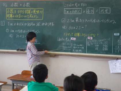 「整数×小数の計算の仕方を考える」学習です。案外筆算で答えを出せる子どもは多いのですが、なぜそうなるのかを説明するとなると難しいようです。友だちの考え方を聞き、