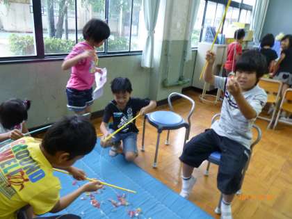 その後は「ゲームフェスタ」です。わかばの子ども4人と先生で、6つのゲームコーナーを作り、3年生の1クラスの6班の人たちに順番に回ってもらい、ゲームを楽しんでもらいました。ゲームの準備に始まり、説明をしたり、お世話をしたり、わかばのみんなは大忙し。それでも、3年生に楽しんでもらえ、大満足でした。