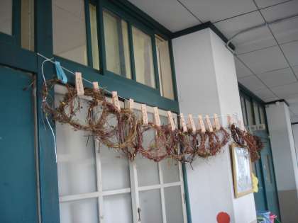 夏の間にたくさん花を咲かせ,ツルを伸ばしたあさがおです。支柱から外せず苦労しながら,友だちと協力して2人組で素敵なリースができました。