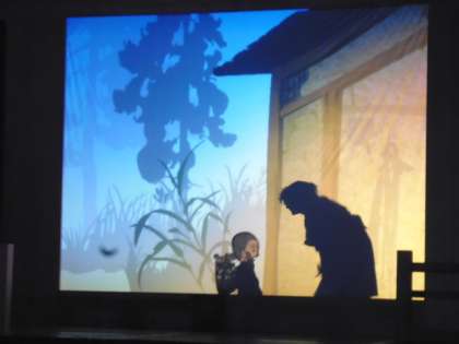 能舞台のような設定で次々と変わる背景。セリフ回しの面白さ、そしてお話の面白さも。子どもたちから大きな笑い声が聞こえました。鑑賞後、外に出て太陽の光を使って、地面に影のふくろうを早速作って遊んでいる子どももいました。