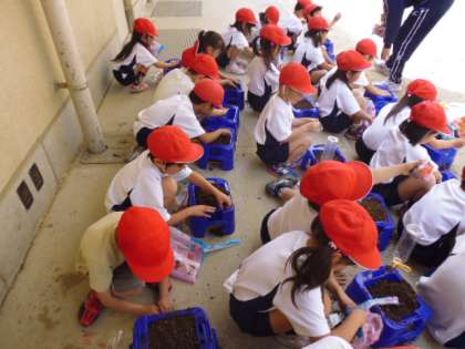 アサガオの種まきをしていました。自分の植木鉢に土を入れ、肥料を混ぜています。種をまくところ5か所に指で穴をあけて、種を一粒ずつまいていました。とても慎重に。やさしく土をかけ、水をやります。さあて、どんな芽がでるのか、そしてやがてどんな色の花が咲くのかが楽しみです。これから毎日自分の鉢に水やりをしてくれることでしょう。どのクラスの子どもたちも先生の話をしっかり聞いて活動していました。それにしてもかわいい子どもたちです。