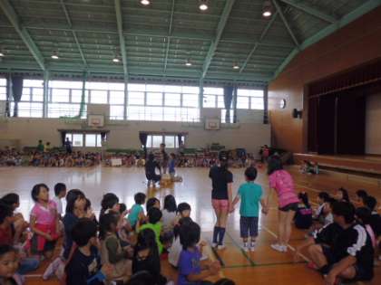 手をつないで一人ずつ入場してきました。各学年から、お迎えの出し物が披露されています。一年生の首には、顔写真と名前が書かれたメダルがぶら下がっています。