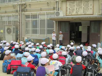 運動場での出発式では,自分で考えて行動することや,5分前行動などのお話がありました。