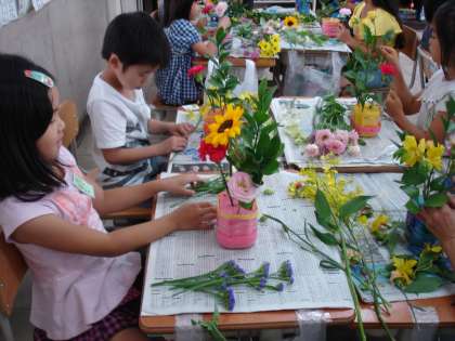 前もって,お家から2Lのペットボトルを持ってきてもらい,マジックで飾った花びんに,自分で選んだ花を切って挿していきます。「お花が水を吸うように茎を斜めに切る」「3cmくらいスポンジに挿す」など初めての経験をしていきました。