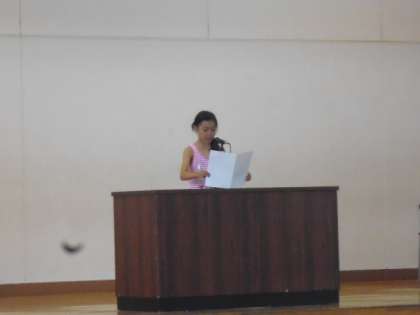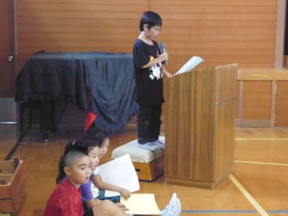 感動体験の発表は3年生です。司会の係をする人たちと発表者が会を進めてくれます。「みんなでそだてたあげはちょう」では、クラスで育ててきたアゲハチョウの成長の様子をくわしく話してくれました。すかだを変えていく様子がよく分かります。「バスの中でのできごと」では、社会見学で京都駅に出かけるバスの中での出来事です。席を譲ってくれた友達の素敵なところが発見できたうれしい気持ちを発表してくれました。フロアからは、昆虫を育てているときに同じような経験をした話や「やっぱり友達っていいなあ」と改めて感じたことを発表してくれました。