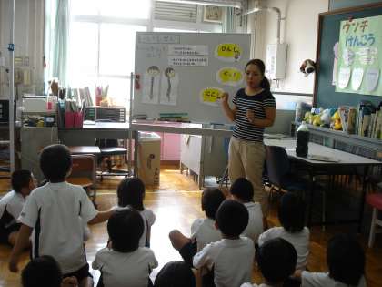 計測の前に,「正しい姿勢」についてお話を聞きました。背骨をまっすぐに,ほどよく伸ばした姿勢がいい姿勢だと知った子どもたち。「良い姿勢」を意識して学習に取り組めるといいですね。