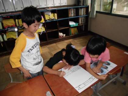 後期が始まり1週間が経ちました。運動会や遠足など学校行事に忙しい中,1年生は新たに「係活動」に取り組んでいます。まず,クラスにあったらいいなと思う係を話し合い,早速自分がやりたい係を決めました。そして,係カードを協力して書き上げました。