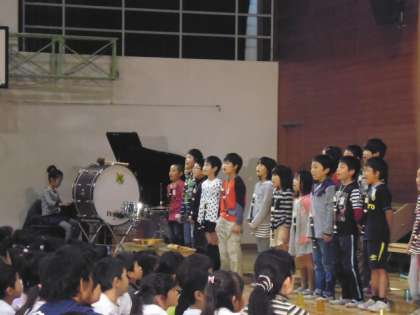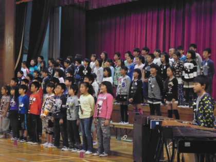 4年生は「ミュージック ステーション IN葛野」です。タモリさんが出てくるあの歌番組? 子どもたちは、「もののけ姫」などのいろいろな曲を歌ったり、リコーダーで演奏したり、合奏したりしてくれました。司会者が演奏する子どもたちに、インタビューして聞いてほしいところなどを発表していました。客席までも巻き込み、会場全体を盛り上げてくれました。