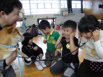 犬が怖くて緊張している子どももいましたが,犬と接している友だちの様子や心臓の音を聞いているうちに楽しくなって自分から触ってい子がたくさんいました。