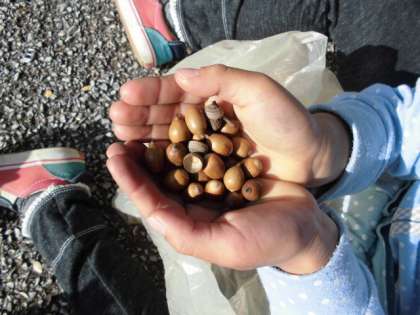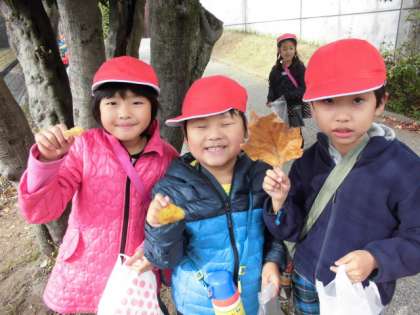 公園につくと,子どもたちはすぐにきれいな模様の葉っぱやいろいろな形のどんぐりを見つけて嬉しそうにビニル袋に入れていました。「このどんぐりで何か作れないかな。」「この大きい葉っぱは,お面になるかも。」と友だちと話も弾みます。